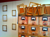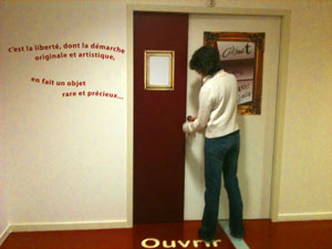Maud Dupuis : la demande du réseau des médiathèques était de réaliser un lieu d'exposition entre le cabinet des curiosités et le café littéraire. J'ai recréé cette atmosphère en jouant sur le trompe-l'œil, avec des faux cadres, de fausses armoires. Ces habillages graphiques servent de réserve, car il est impossible de présenter tous les livres singuliers de la médiathèque. Pour faire la transition avec le reste de la médiathèque, des phrases en forme de vagues, définissent le livre singulier sur les murs. Elles forment un parcours qui mène du livre à l'objet, de la médiathèque au cabinet des livres singuliers.